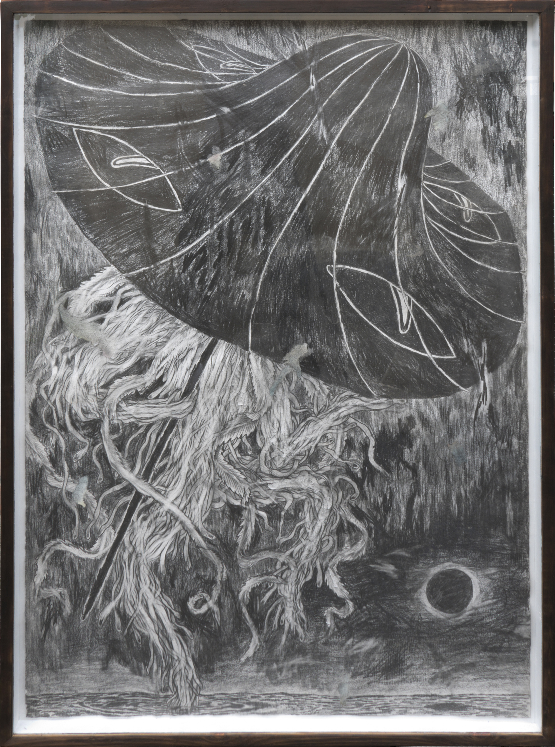 Eclipse, pencil, watercolour and dirt on paper, 82 x 116 cm. Framed with burned wood, 2018